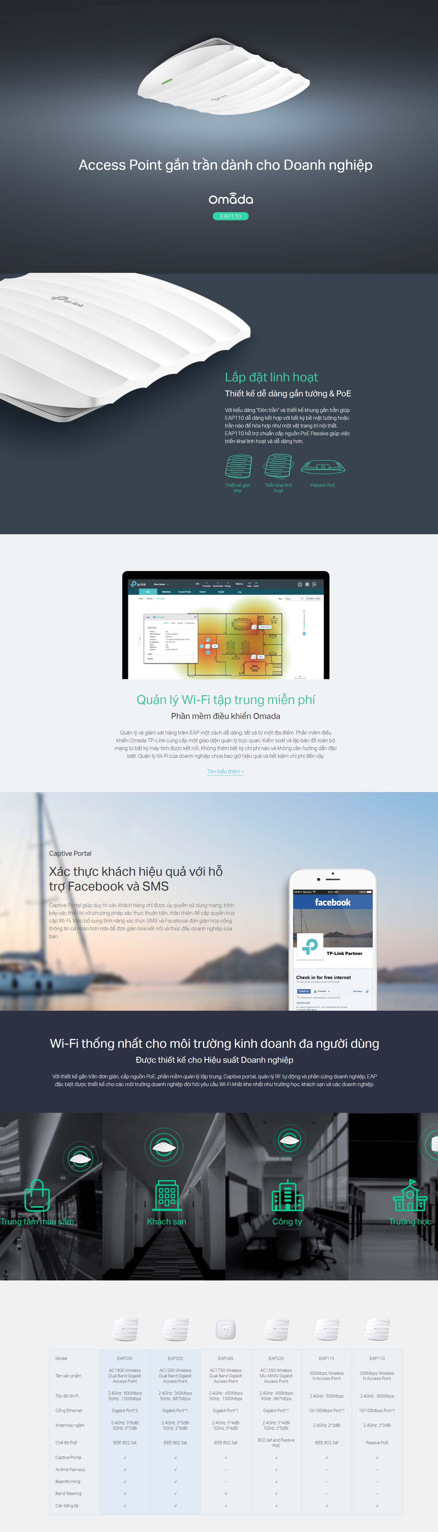 | Bảo mật Wi-Fi | Xác thực Captive Portal Kiểm soát truy cập Lọc địa chỉ Mac Wi-Fi Cô lập Wi-Fi giữa các máy khách Gán VLAN cho SSID Phát hiện AP giả mạo Hỗ trợ 802.1X 64/128/152-bit WEP / WPA / WPA2-Enterprise,WPA-PSK / WPA2-PSK |