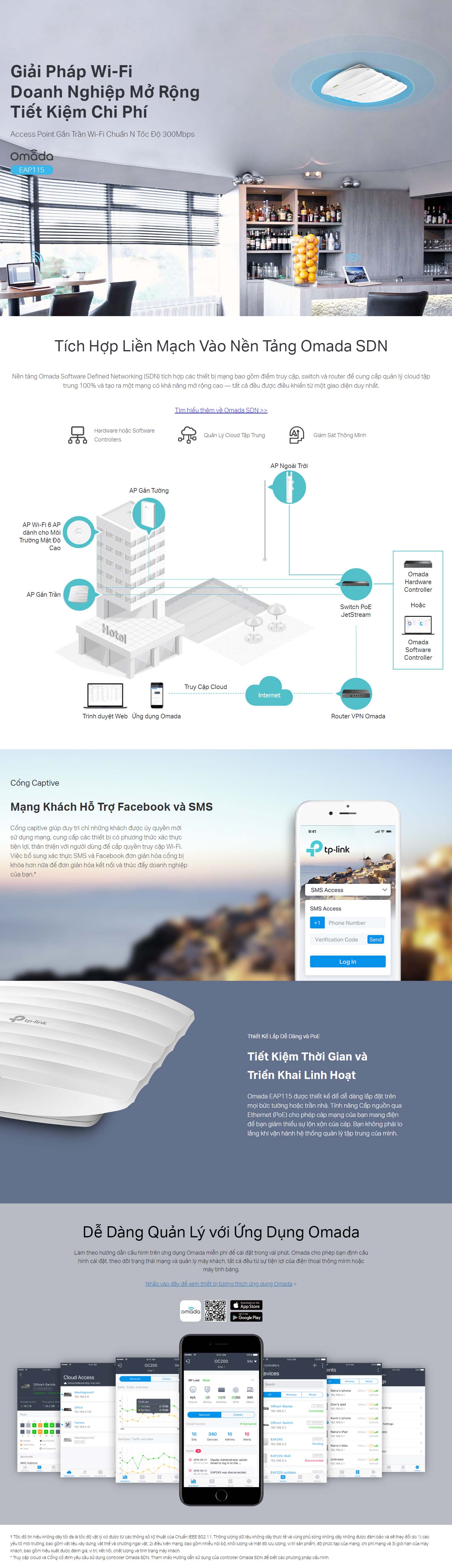| Sản phẩm bao gồm | Access Point gắn trần Wi-Fi chuẩn N tốc độ 300Mbps EAP115 Bộ chuyển đổi nguồn Bộ lắp đặt Hướng dẫn cài đặt |