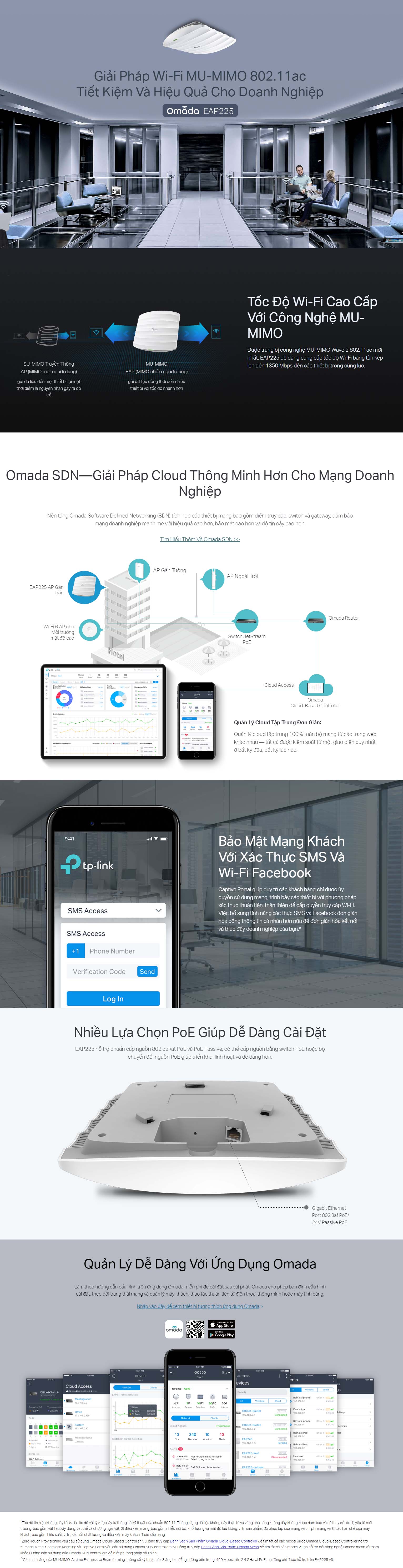 | Sản phẩm bao gồm | Access Point gắn trần Wi-Fi Gigabit MU-MIMO AC1350 EAP225 Bộ chuyển đổi PoE Passive, Dây điện Bộ lắp đặt Hướng dẫn cài đặt |