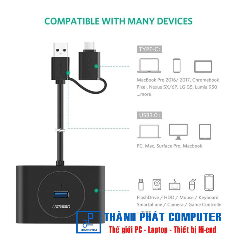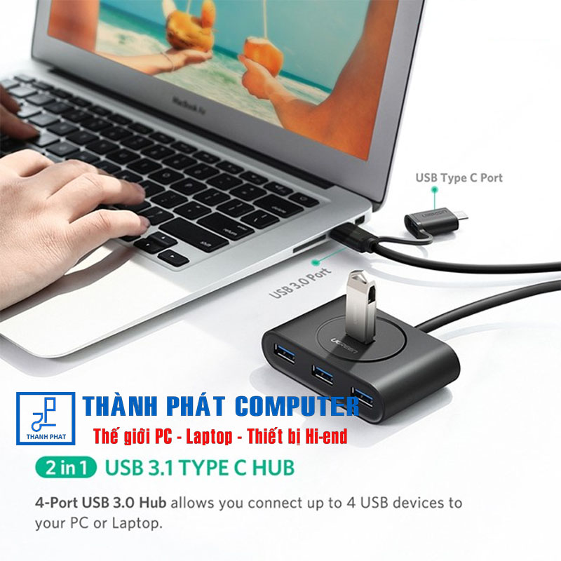 Bộ chia USB Type-C 4 cổng USB 3.0 Ugreen 40850, giúp bạn dễ dàng gia tăng thêm 4 cổng USB 3.0 để kết nối với các thiết bị ngoại vi như ổ cứng ngoài, ổ đĩa flash USB, chuột, bàn phím, tai nghe USB,...