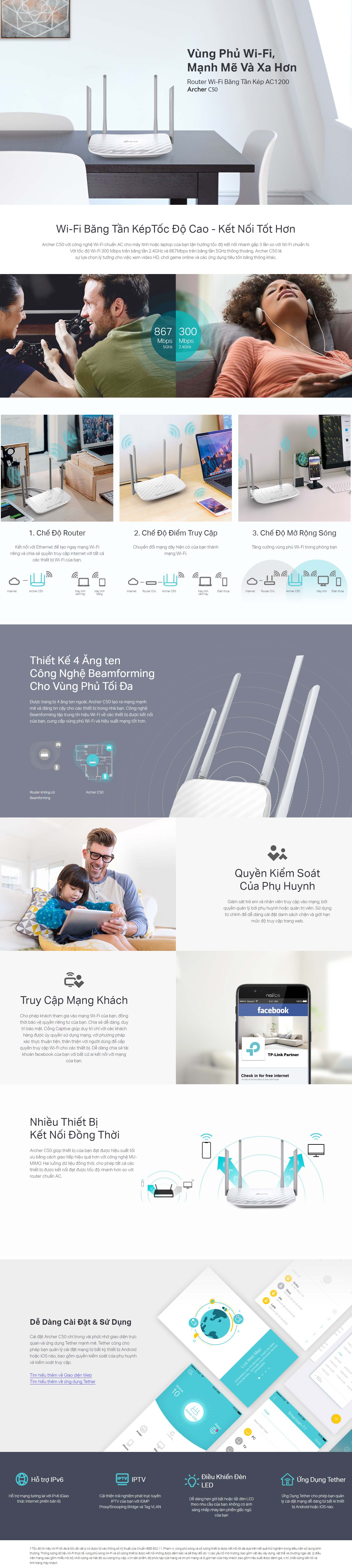 | Package Contents | Router Wi-Fi Archer C50 Bộ chuyển đổi nguồn Cáp Ethernet RJ45 Hướng dẫn cài đặt nhanh |
