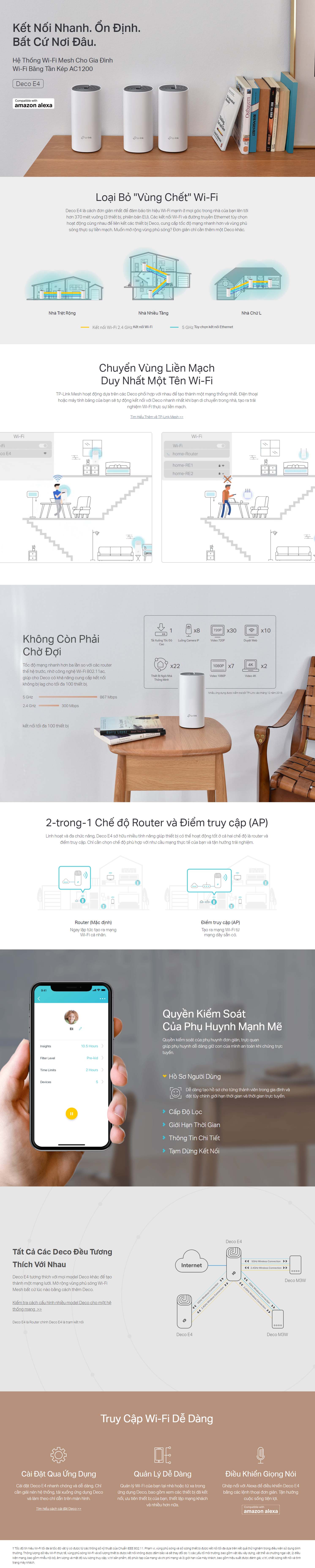 | Package Contents | Deco E4 (3-pack) 3 Thiết Bị Deco E4R 1 Cáp Ethernet RJ45 3 Bộ Chuyển Đổi Nguồn 1 Hướng Dẫn Cài Đặt Nhanh Deco E4 (2-pack) 2 Thiết Bị Deco E4R 1 Cáp Ethernet RJ45 2 Bộ Chuyển Đổi Nguồn 1 Hướng Dẫn Cài Đặt Nhanh Deco E4 (1-pack) 1 Thiết Bị Deco E4R 1 Cáp Ethernet RJ45 1 Bộ Chuyển Đổi Nguồn 1 Hướng Dẫn Cài Đặt Nhanh |