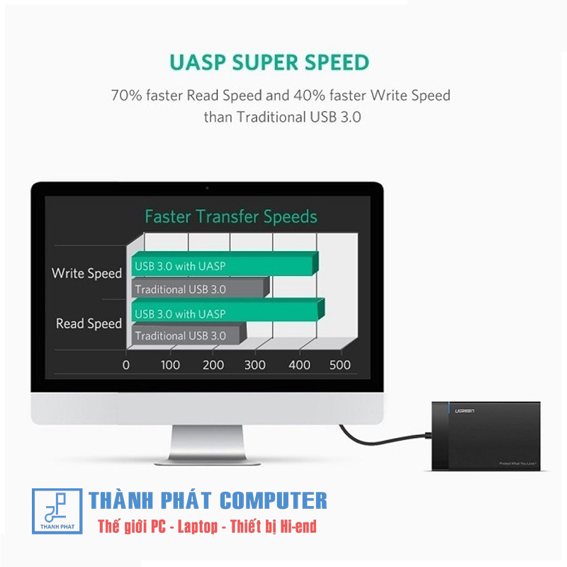 - Giao diện SATA của sản phẩm Ugreen 30847 hỗ trợ giao thức truyền tải tăng tốc UASP và giao diện USB 3.0 hỗ trợ tốc độ truyền tải dử liệu lên tới 5Gbps