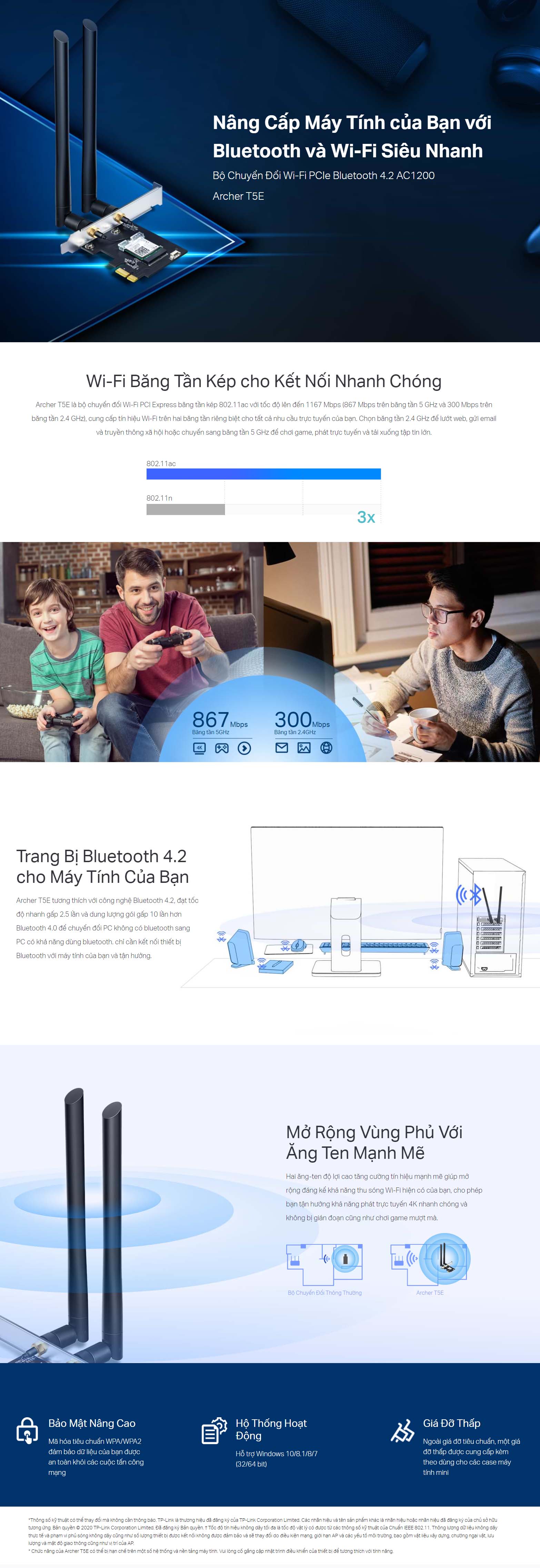 | Sản phẩm bao gồm | Bộ Chuyển Đổi Wi-Fi PCIe Bluetooth 4.2 Archer T5E AC1200 Giá đỡ tiêu chuẩn và giá đỡ thấp Hướng dẫn cài đặt nhanh Cáp USB Bluetooth CD nguồn |