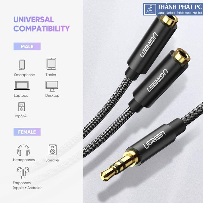 Cáp chia cổng tai nghe 3.5mm 1 ra 2 cao cấp Ugreen 70102 là phụ kiện tuyệt vời giúp bạn chia cổng audio 3.5mm trên điện thoại, máy tính bảng, laptop, máy nghe nhạc... từ 1 cổng thành 2 cổng, giúp kết nối cùng lúc 2 tai nghe, loa... cùng lúc.