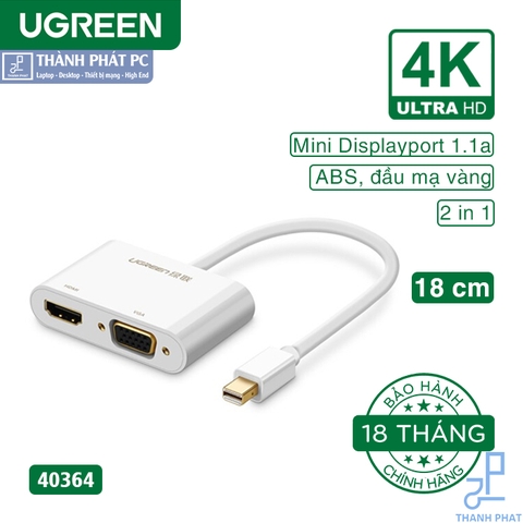Cáp chuyển đổi 2 trong 1 Mini displayport to HDMI / VGA hỗ trợ 4K*2K Ugreen UG-40364. Là bộ chuyển đổi liền mạch có thể kết nối Macbook của bạn, MacBook Pro, hay MacBook Air với một DisplayPort Mini cho máy chiếu của bạn để tận hưởng những video chất lượng. Bạn có thể kết nối máy tính của bạn với hầu hết các máy chiếu thành công.