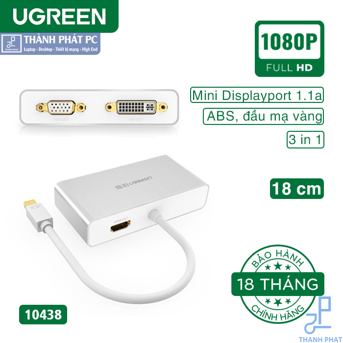 Cáp chuyển đổi 3 trong 1 Mini displayport to HDMI/VGA/DVI Ugreen UG-10438. Là bộ chuyển đổi liền mạch có thể kết nối Macbook của bạn, MacBook Pro, hay MacBook Air với một DisplayPort Mini cho máy chiếu của bạn để tận hưởng những vedio chất lượng. Bạn có thể kết nối máy tính của bạn với hầu hết các máy chiếu thành công.