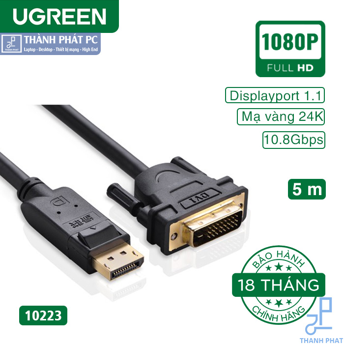 Cáp Displayport to DVI 24+1 dài 5m chính hãng Ugreen 10223 cho phép bạn dễ dàng kết nối một màn hình DVI hoặc máy chiếu để một hệ thống hoặc card đồ họa với một kết nối DisplayPort.