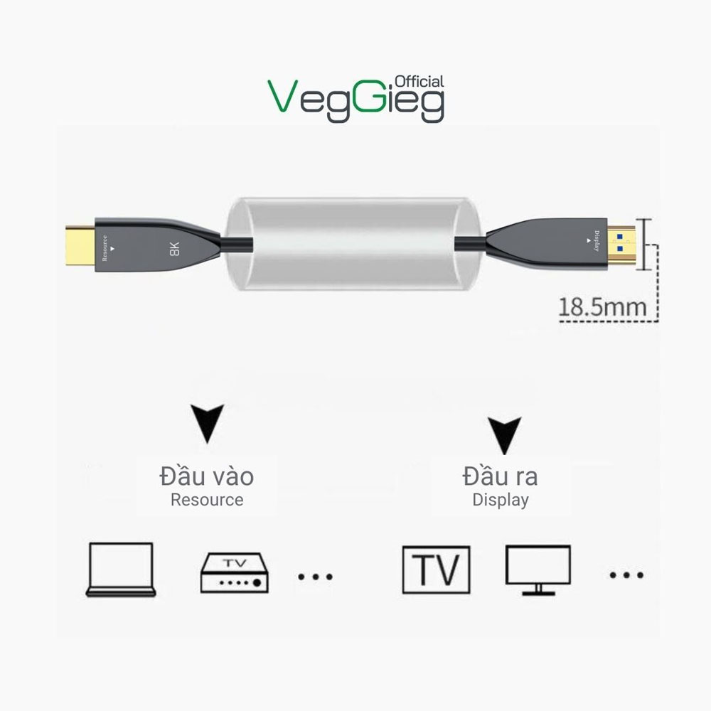 📌Lưu ý sử dụng: Cáp HDMI quang 2.1 Veggieg là loại cáp một chiều, vì vậy hãy chắc chắn kết nối đúng đầu nguồn và đầu hiển thị khi sử dụng.