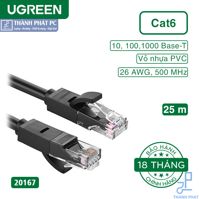 Cáp mạng Cat6 dài 25m chính hãng Ugreen 20167 chất lượng cao để giảm thiểu sự mất mát tín hiệu và điện năng tiêu thụ trong khoảng cách dài cáp này cung cấp hiệu suất lên đến 3500 MHz và phù hợp cho 10-100-1000 (Fast Ethernet) và nó được thiết kế để sử dụng trên các mạng Ethernet / RJ45.