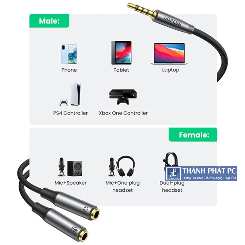 Cáp chia loa 1 ra 2 Ugreen 50254 chuyển đổi từ một jack 3.5mm ra hai chuẩn cắm 1 đầu Audio 3.5mm và 1 đầu Microphone ,âm thanh được chia ra 2 tín hiệu chất lượng không hề thay đổi.