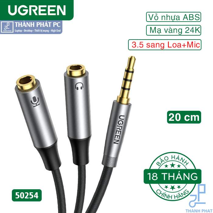 Cáp chia loa 1 ra 2 Ugreen 50254 chuyển đổi từ một jack 3.5mm ra hai chuẩn cắm 1 đầu Audio 3.5mm và 1 đầu Microphone ,âm thanh được chia ra 2 tín hiệu chất lượng không hề thay đổi.