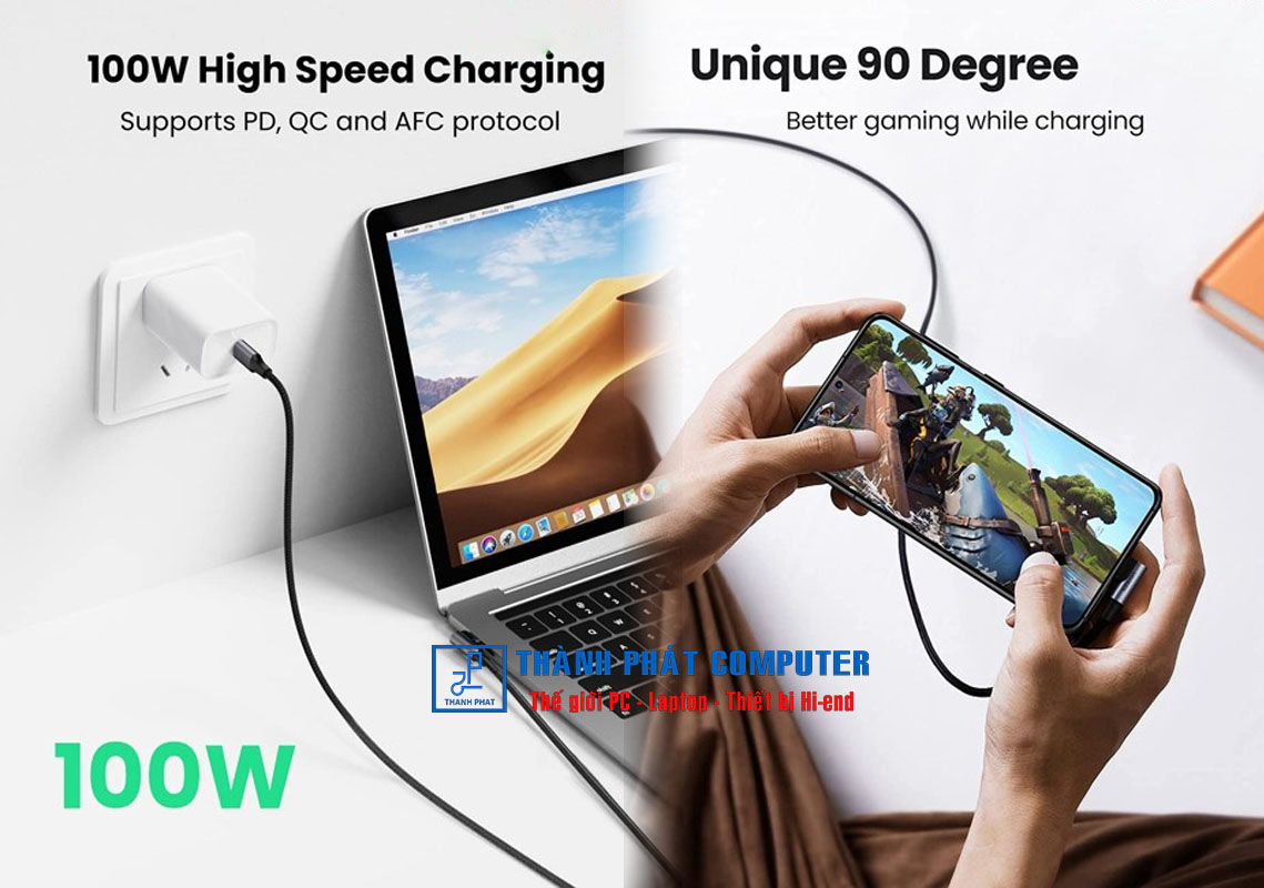 Cáp sạc Type-C to Type-C Ugreen 20583 nhanh hơn 52% so với cáp USB C 60W, đầu ra 100W (20V 5A) có khả năng sạc các máy tính xách tay như MacBook Pro 16 inch với tốc độ 39% trong 30 phút ở tốc độ tối đa hoặc sạc đầy năng lượng cho Samsung Galaxy S21 trong 1 giờ mà không có vấn đề gì.