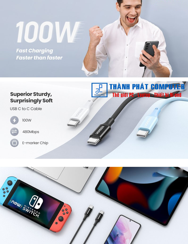 Khả năng tương thích rộng: Cáp Ugreen 15275 USB-C to C tương thích với iPhone 15 Pro Max/15 Pro/15 Plus/15, Macbook Pro 15"/13", Macbook, Macbook Air, iPad Pro 2022/2021/2020, Google Pixel 7/6 /5/4/3, Samsung Galaxy Note 10/S23/S22/S21/S20/S10/S9, Nexus 6P, NS Switch, Huawei Matebook X Pro, Mate 60 Pro, Chromebook, Dell XPS 13, Lenovo Yoga 900 720, ThinkPad X1, Razer Blade Stealth, ASUS ZenBook 3, máy tính xách tay HP Spectre, v.v.