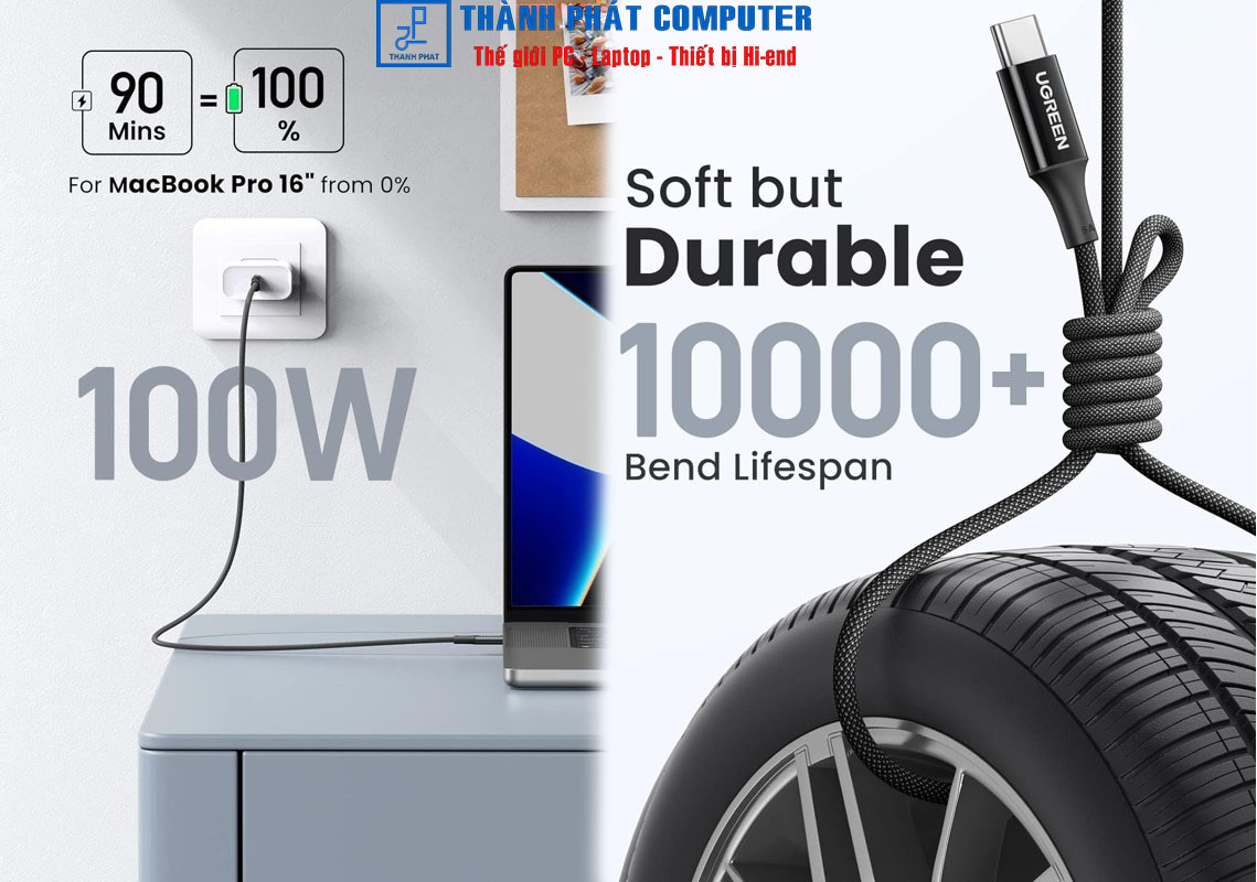 Cáp sạc nhanh Ugreen 15275 cho máy tính xách tay hoặc điện thoại thông minh USB-C của bạn ở dòng điện tối đa 20V/5A, hỗ trợ sạc nhanh PD phân phối điện 100W 87W 61W 45W 30W 18W.