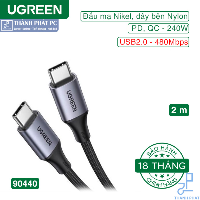Cáp sạc Ugreen 90440 với chip E-Marker (HUB332A) bên trong, sạc nhanh các thiết bị USB-C của bạn ở dòng điện tối đa 48V5A, hỗ trợ sạc nhanh PD phân phối điện 240W 100W 87W 61W 45W 30W 18W.