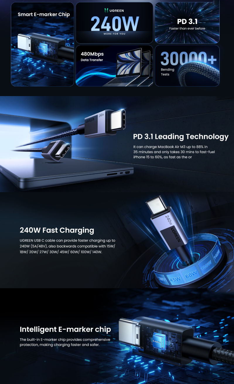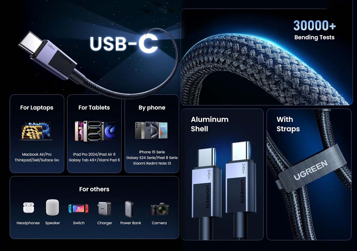 - Tính năng: Cáp sạc 240w USB-C to USB-C cho macbook, iphone 15, s24, s25