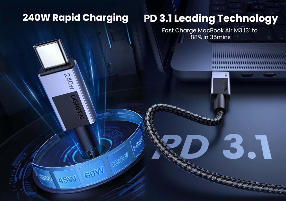 Sạc nhanh 240W Ugreen 45067 cung cấp công suất tối đa 240W, sạc nhanh cho điện thoại, máy tính bảng hoặc máy tính xách tay USB-C của bạn, cũng hỗ trợ 15W, 18W, 27W, 30W, 45W, 60W và 100W, giảm thời gian chết và giúp bạn luôn có điện