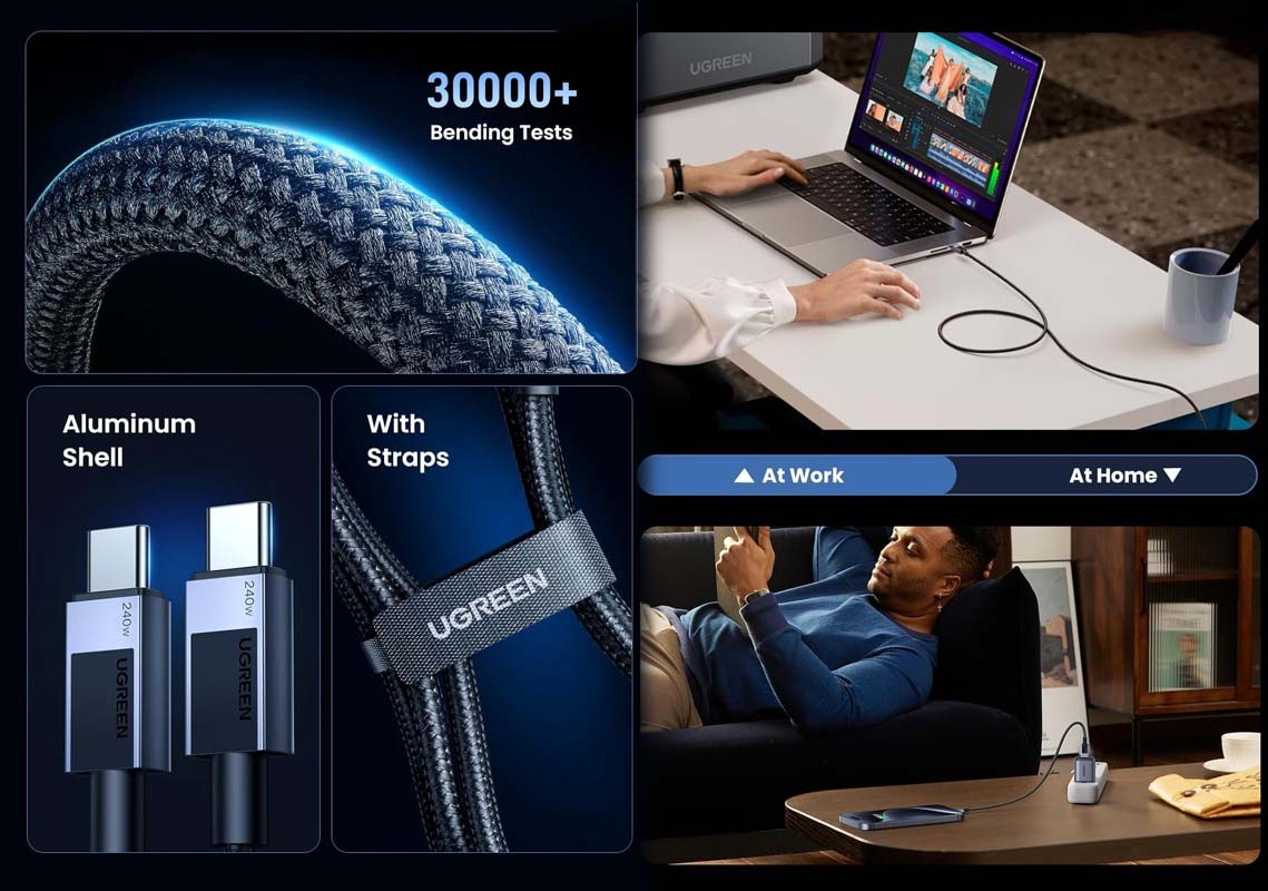 Cáp USB-C sang USB-C 240W đi kèm với lớp bện nylon, bền và chịu được sự hao mòn hàng ngày; Chip E-marker giúp cáp USB C sạc thiết bị an toàn và ổn định hơn. Không thể truyền video, không hỗ trợ màn hình