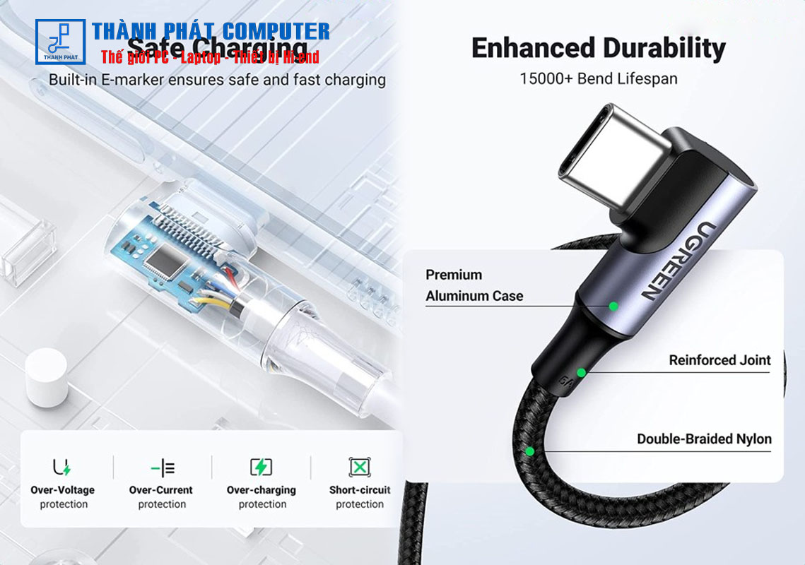 Cáp Ugreen bện nylon chắc chắn và bền đảm bảo tuổi thọ dài hơn lên đến 10.000 lần uốn. Đầu nối USB C hai mặt với khả năng giảm căng thẳng khi mở rộng quá mức được thiết kế để cắm thường xuyên. Vỏ nhôm, dây đồng có độ tinh khiết cao, ba lớp bảo vệ sẽ giữ hiệu suất sạc nhanh lâu dài.