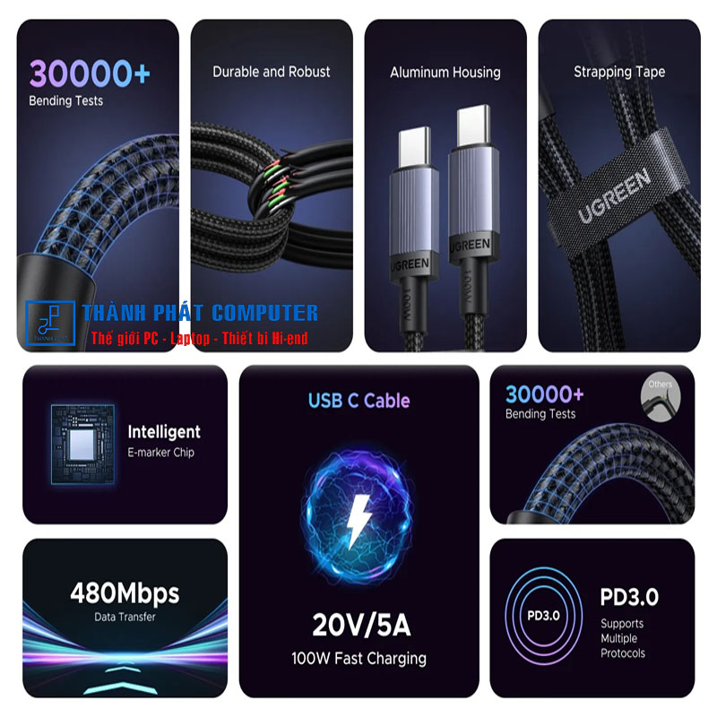 Cáp sạc nhanh với thiết kế hiện đại, nhỏ gọn, và bền bỉ, Ugreen 65834 được trang bị hai đầu Type-C hỗ trợ công suất sạc lên đến 100W, truyền dữ liệu 480Mbps tương thích với hầu hết các thiết bị như laptop, smartphone, tablet và các phụ kiện công nghệ khác.