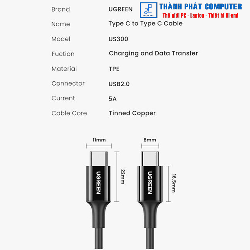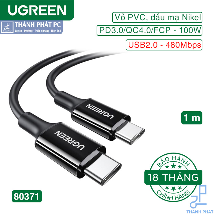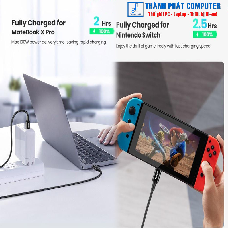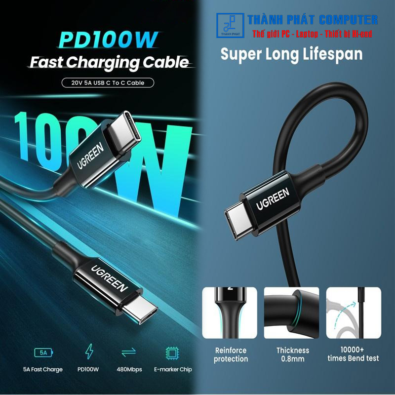 Cáp sạc nhanh PD 100W Ugreen 80371 hỗ trợ sạc nhanh PD QC 4.0, 3.0 công suất tối đa 100W, dòng 5A. Cho phép sạc nhanh cho Điện thoại thông minh, Máy tính bảng…
