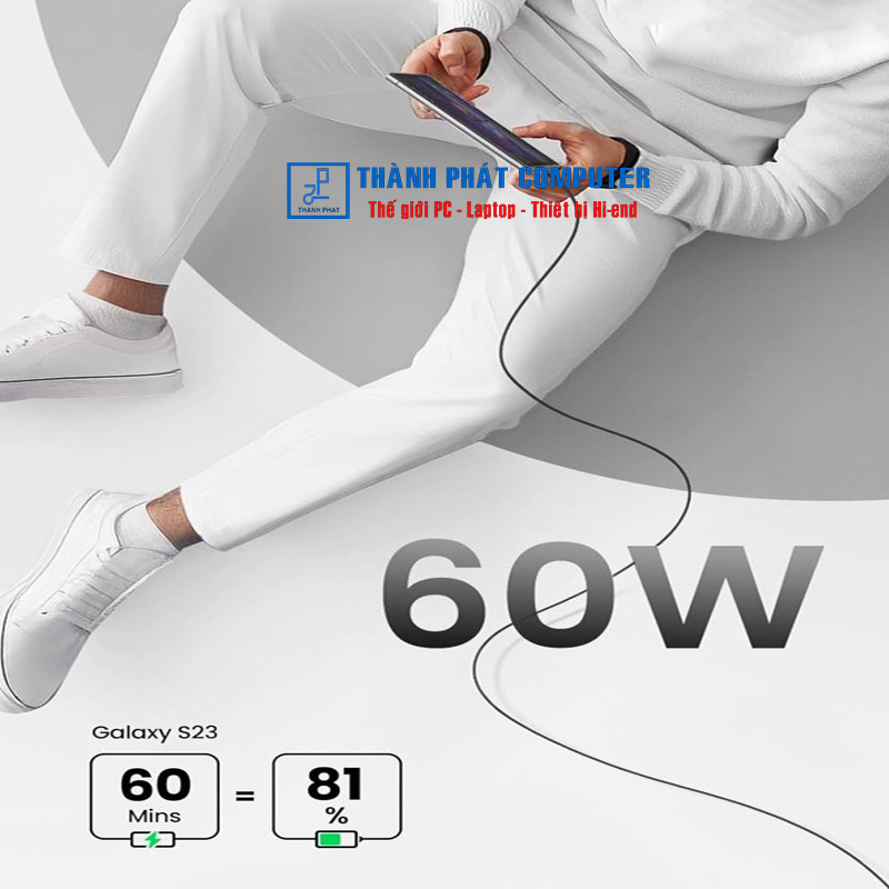Hỗ trợ công suất đầu ra tối đa 60W để sạc đầy MacBook Air 13" của bạn trong 1,5 giờ khi kết hợp với bộ sạc PD 60W. Trong vòng 0,5 giờ, iPhone 15 của bạn sẽ được sạc nhanh đến 60%