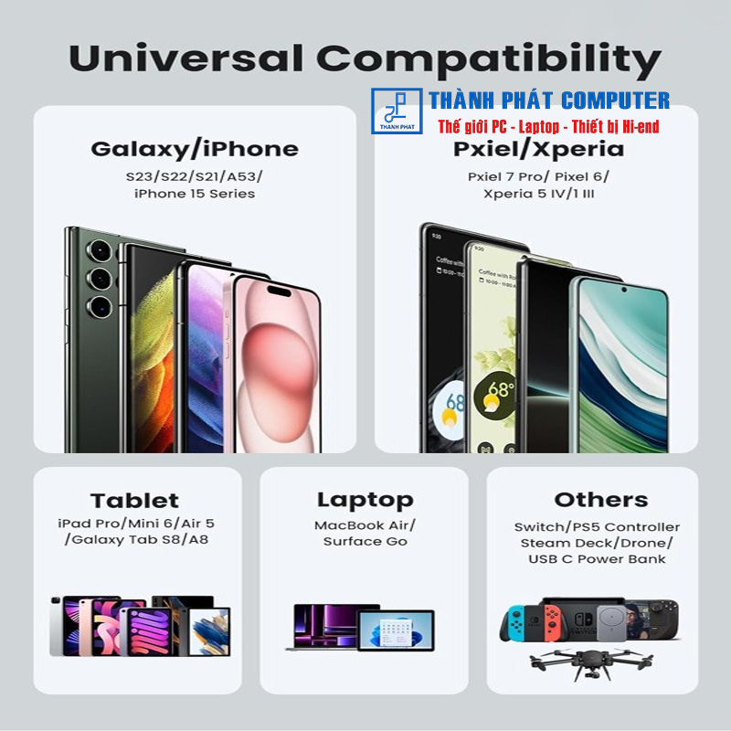 Khả năng tương thích rộng: Cáp USB C sang USB C 60W của UGREEN có thể tương thích liền mạch với điện thoại di động (iPhone 15/15 Plus/15 Pro/Samsung S24/S23/S22, Google Pixel, LG, v.v.), máy tính bảng (iPad Air 5, iPad Mini 6, v.v.), máy tính xách tay (MacBook Air, v.v.), công tắc và nhiều loại khác