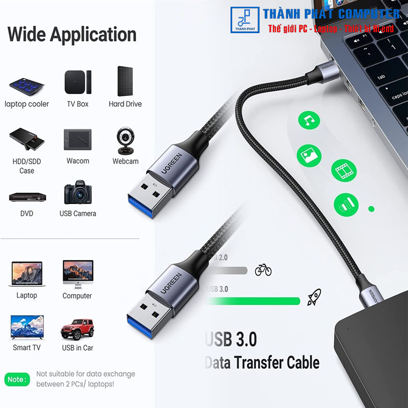Khả năng tương thích rộng: Cáp USB A đến USB A phù hợp với máy tính xách tay, tấm làm mát máy tính xách tay, TV thông minh, USB trên ô tô, đầu DVD, bộ chia USB 3.0, màn hình, máy ảnh, ổ đĩa Blu-ray, hộp trên cùng, hộp đựng ổ cứng ngoài 2.5" với cổng Loại A và hầu hết các ổ cứng gắn ngoài USB 3.0 có cổng Loại A.