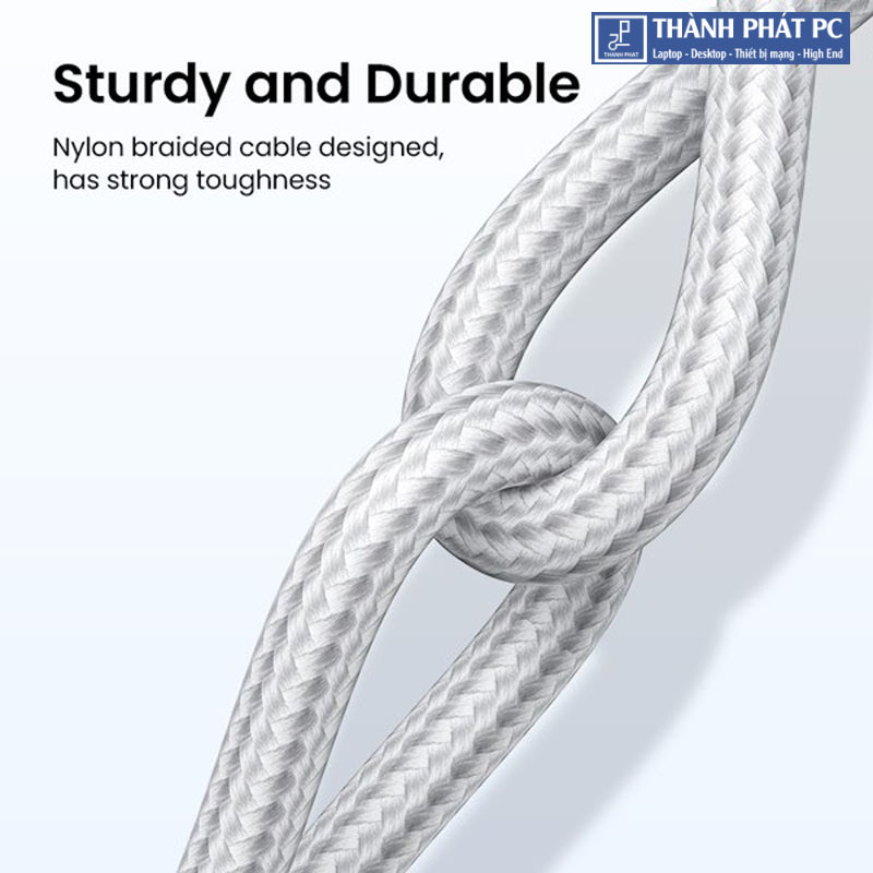 Cấu tạo lõi cáp bằng đồng, chống ăn mòn, có lớp bọc lưới nylon bên ngoài, cung cấp truyền dẫn tối đa giảm suy hao dòng sạc, và ổn định tốc độ kết nối dữ liệu.