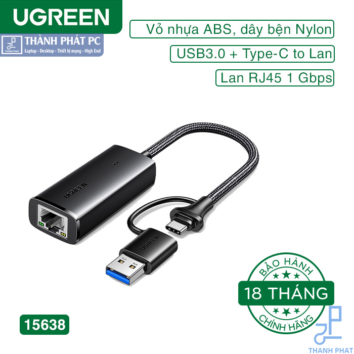 Bộ chuyển đổi Ethernet Ugreen 15638 USB-A & USB-C 3.0 đực sang RJ45 kết nối máy tính hoặc máy tính bảng của bạn với bộ định tuyến, modem hoặc bộ chuyển mạch mạng để kết nối mạng.