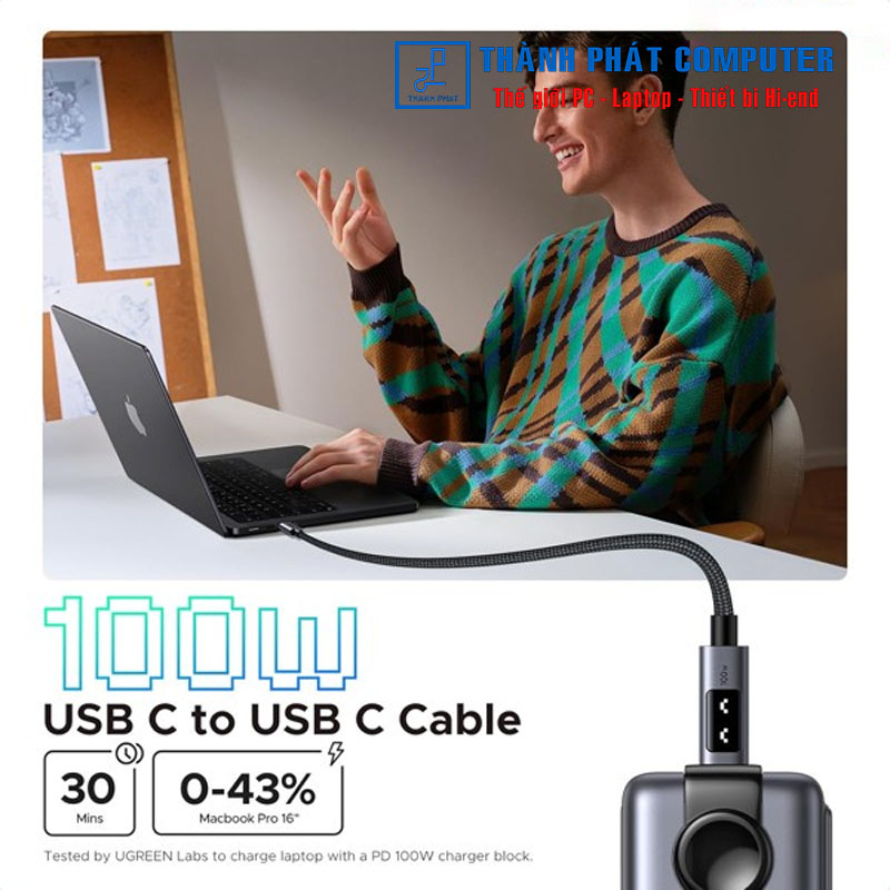 Cung cấp đầu ra lên đến 20V/5A, Cáp sạc USB C UGREEN 100W sạc thiết bị của bạn ở tốc độ đáng kinh ngạc, nhanh chóng nạp đầy Macbook Pro 16'' lên đến 42% chỉ trong 30 phút. Cũng hỗ trợ truyền tệp ở tốc độ 480Mbps, tệp 1G có thể được đồng bộ hóa trong vòng 30 giây.