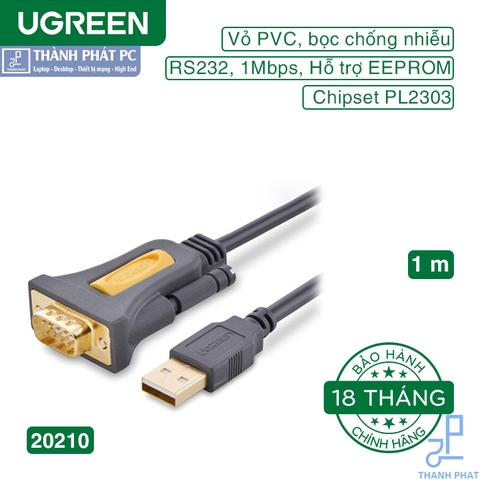 Cáp USB to Com dài 1m Ugreen 20210 cho phép người dùng máy tính thêm một cổng nối tiếp thêm cho các kết nối RS-232 sử dụng USB. Nó cung cấp một cổng plug-and-play bên ngoài để kết nối thuận tiện của điện thoại di động, máy ảnh kỹ thuật số, PDA, modem và thiết bị đầu cuối ISDN.