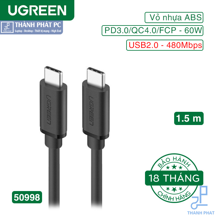 Cáp sạc, dữ liệu USB Type-C dài 1.5m Ugreen 50998 chính hãng là cáp sạc cho Macbook kết nối USB-C dương trên cả hai đầu cáp, sử dụng để sạc và đồng bộ hóa dữ liệu.