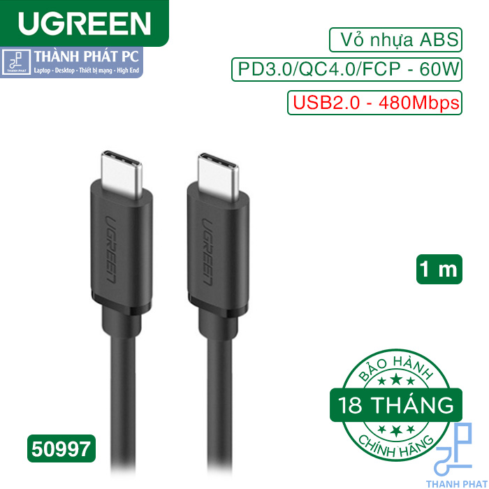 Cáp sạc, dữ liệu USB Type-C dài 1m Ugreen 50997 chính hãng là cáp sạc cho Macbook kết nối USB-C dương trên cả hai đầu cáp, sử dụng để sạc và đồng bộ hóa dữ liệu.