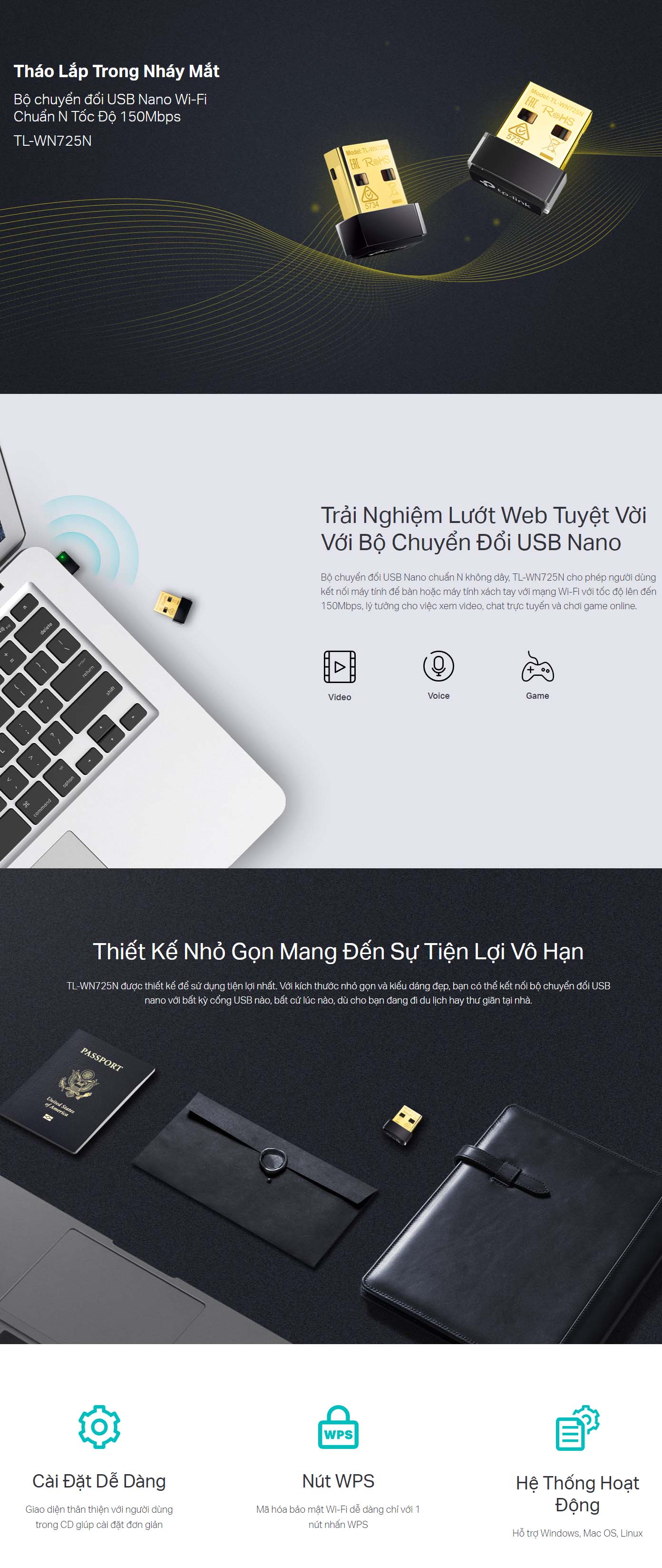 | Sản phẩm bao gồm | Bộ chuyển đổi USB Nano Wi-Fi chuẩn N TL-WN725N CD nguồn Hướng dẫn cài đặt nhanh |