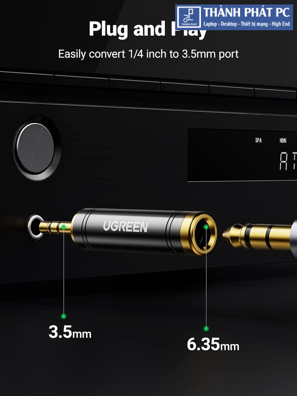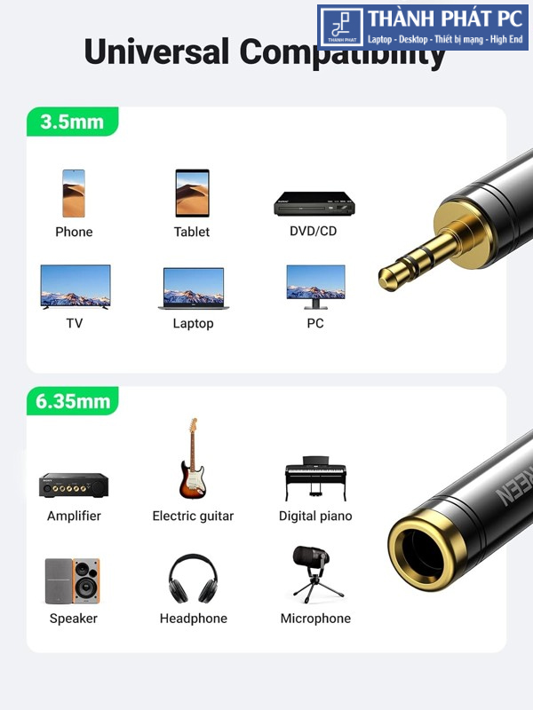 Bộ chuyển đổi giắc âm thanh Ugreen 60711 3,5 mm đến 1/4 inch có thể dễ dàng kết nối điện thoại thông minh, máy tính bảng, iPod hoặc tai nghe có phích cắm âm thanh nổi 3,5 mm (1/8 inch) tiêu chuẩn với các thiết bị âm thanh có giắc cắm 1/4 inch thông qua 1/4" cáp nam sang nam