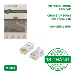 Hạt mạng RJ45 Cat5E Veggieg V-E003 là sản phẩm chất lượng cao, được làm từ nhựa LG PC trong suốt, thân thiện với môi trường và sử dụng các vật liệu cao cấp đảm bảo hiệu suất và độ bền. Chốt linh hoạt, có thể uốn cong vào một góc lớn cho nhiều lần sử dụng. Kết nối mạ vàng chống ăn mòn, cải thiện hiệu suất tín hiệu, giúp duy trì chất lượng kết nối tốt nhất.