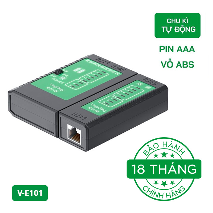 Hộp Test mạng VegGieg V-E101 là thiết bị chuyên dụng để kiểm tra đầu bấm mạng LAN và điện thoại, tương thích với các đầu bấm RJ45 và RJ11. Sản phẩm này dễ dàng sử dụng và giúp bạn nhận biết liệu đầu dây có được bấm đúng theo cặp hay không.