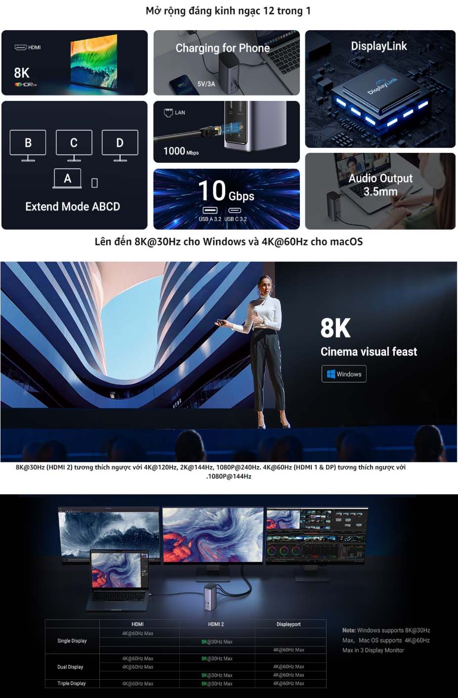 Tính năng: Hub chuyển đổi đa năng 12 trong 1 ra nhiều cổng mở rộng hỗ trợ HDMI đến 8K@30Hz