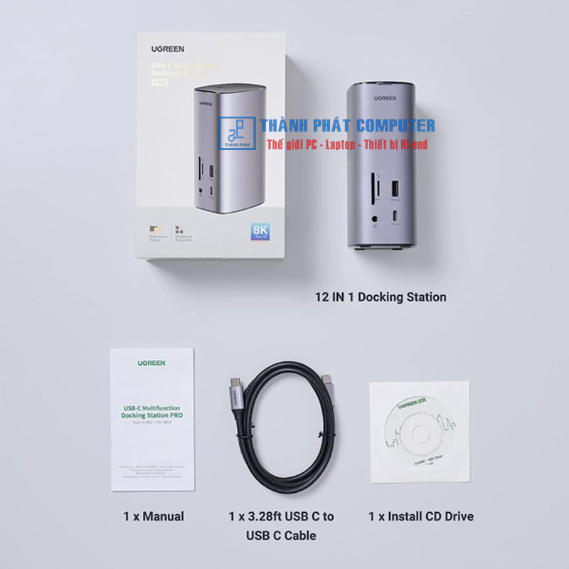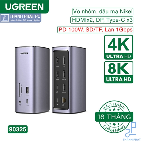 Dock Ugreen 90325 là thiết bị USB-C 12 trong 1 được trang bị 12 cổng mở rộng là HDMI 8K, 1xHDMI 4K, 1x DP 4K, 1x PD 3.0 100w, 1x USB A 3.2, 1x USB C 3.2, 2x USB A 3.0, 1x Gigabit Ethernet, 1x khe cắm thẻ SD/Micro SD và 1 cổng AUX 3.5mm, đáp ứng hầu hết mọi nhu cầu công việc hàng ngày của bạn.