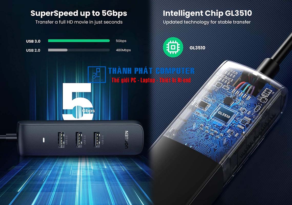 Tốc độ truyền dữ liệu 5 Gbps: Bộ chia cổng USB 3.0 cung cấp tốc độ truyền 5Gbps, nhanh hơn 10 lần so với USB 2.0. Truyền dữ liệu hiệu quả cao cho phim HD và các tệp tin khối lượng lớn.