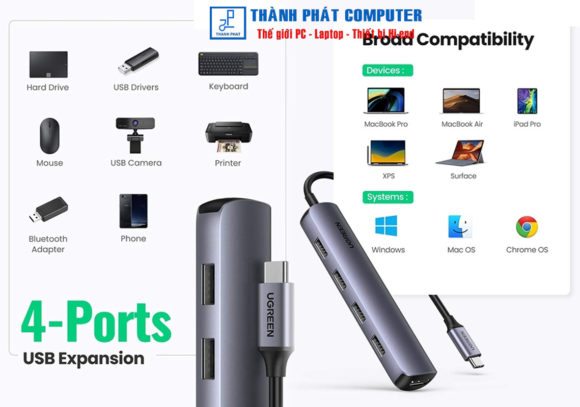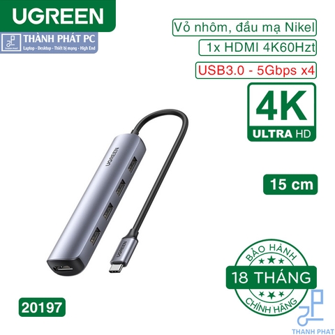 Hub USB C Ugreen 20197 mỏng và bóng bẩy ngay lập tức mở rộng 5 cổng với HDMI và 4 cổng USB 3.0, cải thiện kết nối cho máy tính xách tay và các thiết bị USB C khác. Với bộ chuyển đổi đa cổng này, bạn có thể nhanh chóng kết nối với màn hình HDMI và truyền tệp từ thiết bị USB của mình mà không gặp rắc rối.