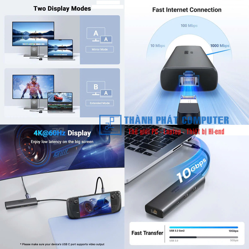 Bắt đầu kỷ nguyên USB tốc độ cao: USB-C Hub 6 trong 1 Ugreen 45000 CM512 hỗ trợ truyền tệp, phim và ảnh với tốc độ lên tới 10 Gbps qua cổng dữ liệu USB-C và hai cổng USB-A 10Gbps. Cổng C cho phép truyển dữ liệu 10Gbps và chỉ có thể được sử dụng để truyền dữ liệu và không hỗ trợ xuất video hoặc sạc.