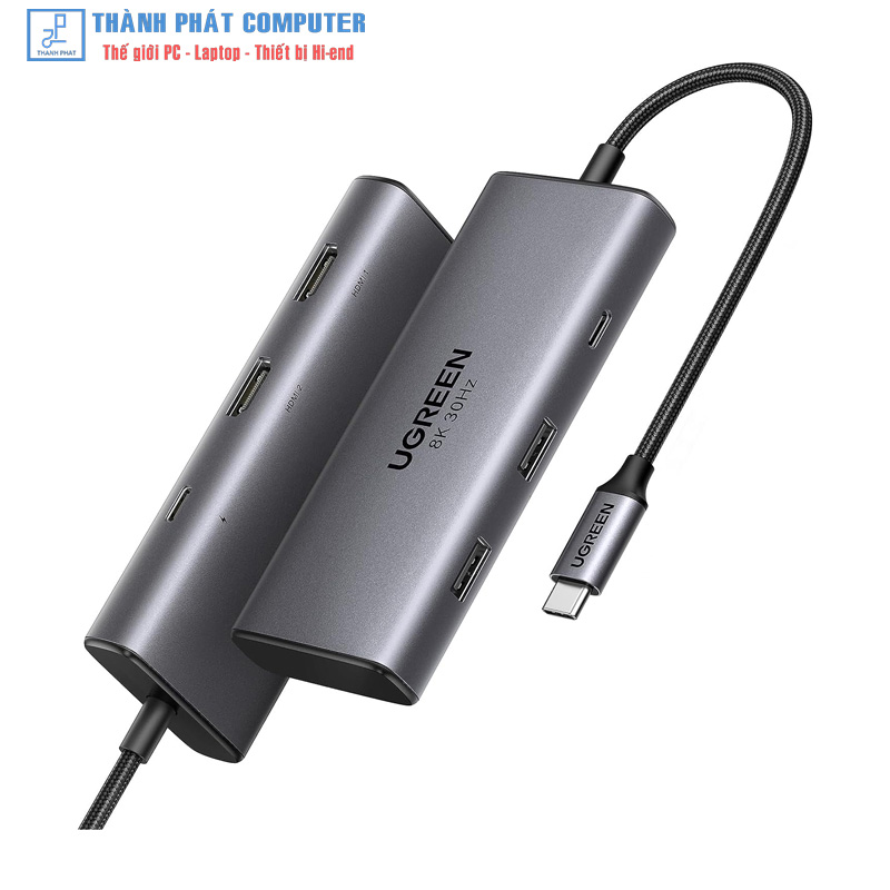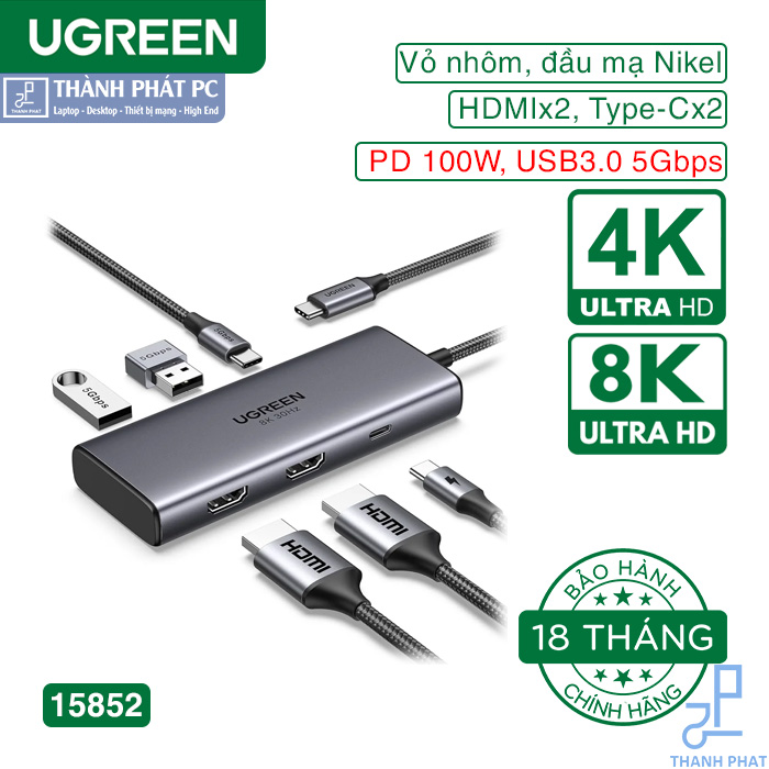 Thiết bị mở rộng USB Type-C Ugreen 15852 hỗ trợ kết nối HDMI kép, được thiết kế để cung cấp mọi nhu cầu kết nối của bạn, HDMI x2, USB-C PD 100W, một cổng dữ liệu USB-C và USB-A x2 tốc độ 5Gbps.