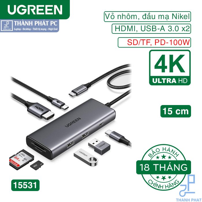 Hub USB-C 7 trong 1 Ugreen 15531 khơi dậy thêm tiềm năng của cổng USB-C trên máy tính xách tay của bạn với cổng USB-C 3.2 Thế hệ thứ 2 tốc độ 10 Gbps, hai cổng USB-A 3.2 Thế hệ thứ 2 tốc độ 10 Gbps, HDMI 4K, Bộ nguồn 100W và Đầu đọc thẻ SD/Micro SD.