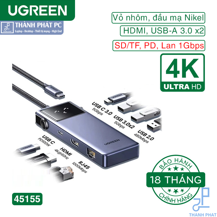 Hub Type-C đa năng Ugreen 45155 có giao diện HDMI và hỗ trợ đầu ra độ phân giải cao 4K/60Hz, cho phép bạn dễ dàng kết nối với màn hình hoặc máy chiếu và tận hưởng chất lượng hình ảnh cực rõ nét.