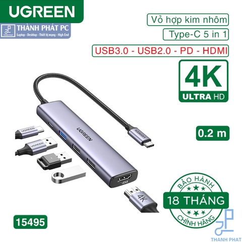 Bộ chuyển đổi điều hợp đa cổng USB-C Ugreen 15495 được trang bị cổng HDMI 4K, cổng sạc USB-C PD 100W, cổng dữ liệu USB-A 5Gbps và hai cổng USB-A 480Mbps.