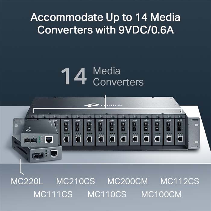 TL-MC1400 khung Rack cắm 14-Khe được thiết kế đặc biệt chứa 14 Media Converter của TP-Link để cung cấp nguồn điện chính, tiết kiệm không gian và các cáp nguồn. Hoạt động liên tục rất quan trọng đối với truyền thông cáp quang, vì vậy khung được trang bị cấp nguồn dự phòng và tính năng Hot-Swapping cho phép lắp đặt/tháo bỏ nguồn điện/converter mà không cần tắt nguồn thiết bị. Hơn nữa, hiệu suất ổn định và tuổi thọ cao, hai quạt làm mát được lắp bên trong. Cùng với các media converter MC series Gigabit / Fast Ethernet, TL-MC1400 là giải pháp lý tưởng cho mạng media của bạn