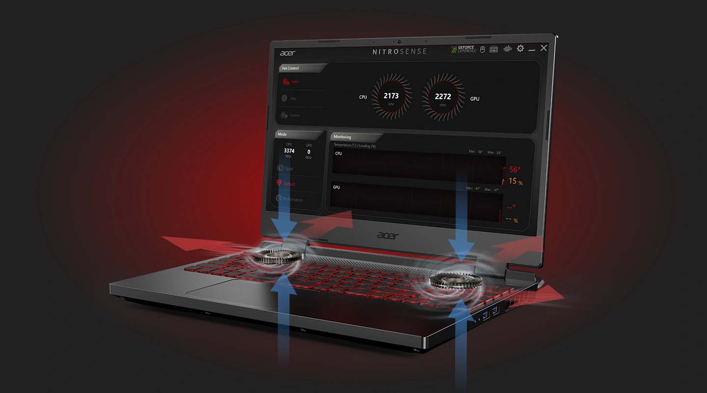 Khung máy được tinh chỉnh để tăng khả năng tản nhiệt với mặt hút gió cả bên trên lẫn dưới cùng bốn ống xả giúp giảm thiểu nhiệt độ của CPU/ GPU một cách tốt nhất. Ngoài ra bạn có thể theo dõi và quản lý hệ thống bao gồm nhiệt độ, tốc độ quạt và hơn thế nữa thông qua NitroSense.